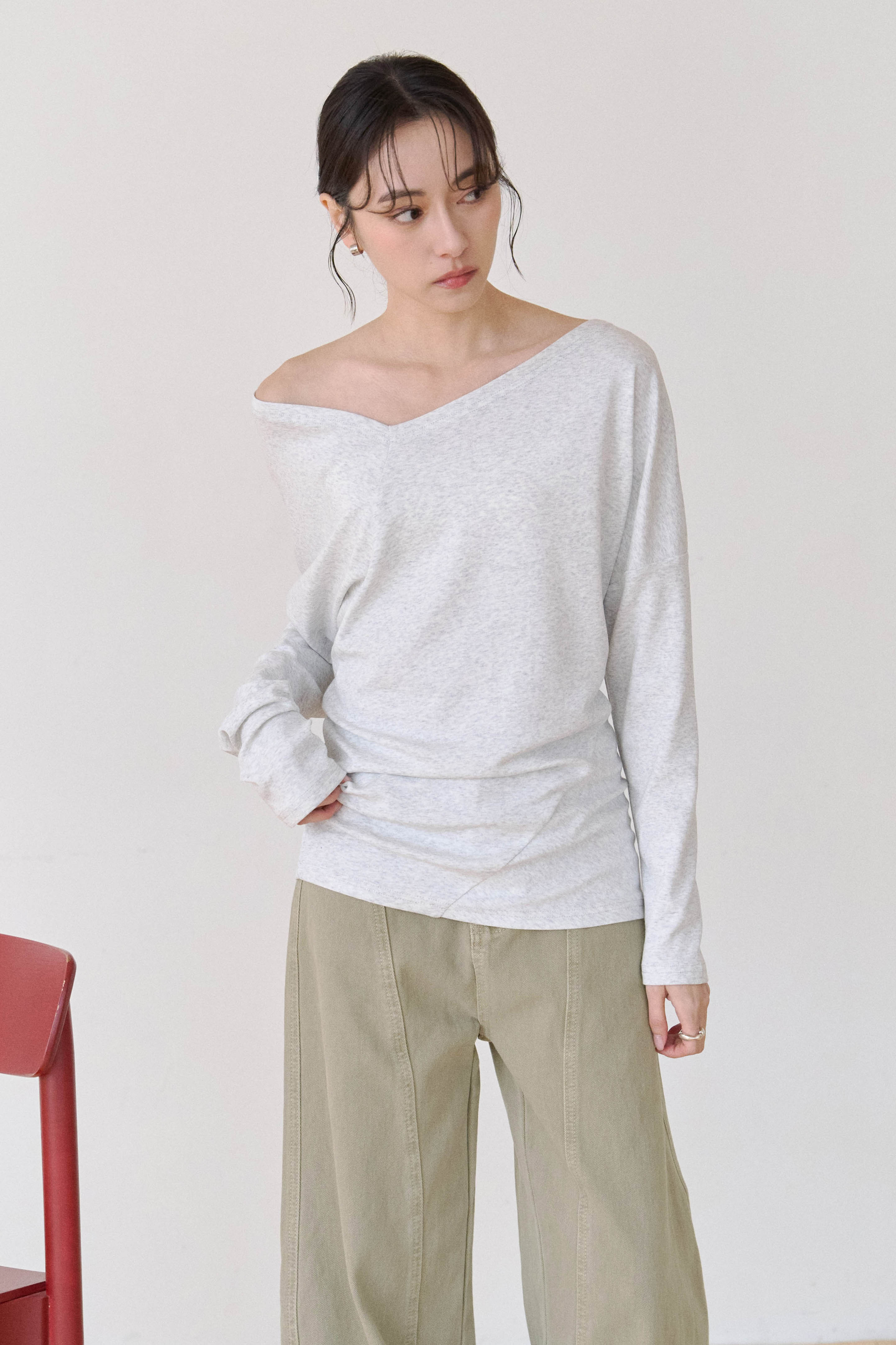 斜領露肩長袖上衣