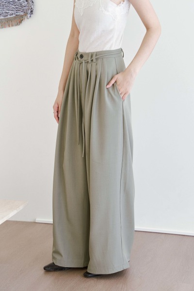 輕薄西裝布料 垂墜感佳 / 多打摺設計 呈現自然線條 / 雙褲耳設計 / 兩側隱藏口袋 / 後臀壓線細節 / 含綁繩