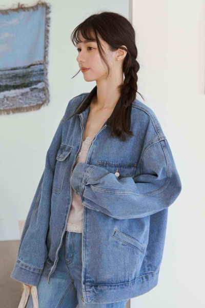 拼接皮領寬版丹寧外套