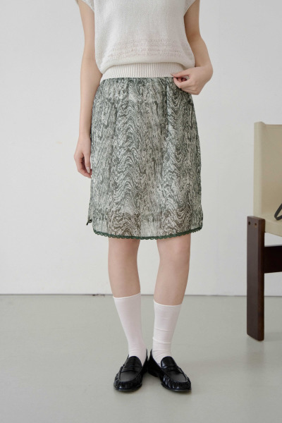抽象線條圖紋 / 下擺蕾絲滾邊造型 / 下擺兩側開衩設計 / 有內裡 / 後拉鍊鬆緊腰頭 / 無口袋