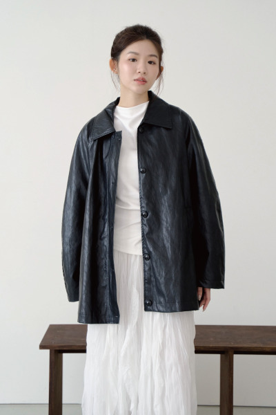 皺皺壓紋感皮革 / 中長蓋臀版型 / 兩側斜口袋 / 有內裡 / 無肩線落肩版型 / 日常簡約款