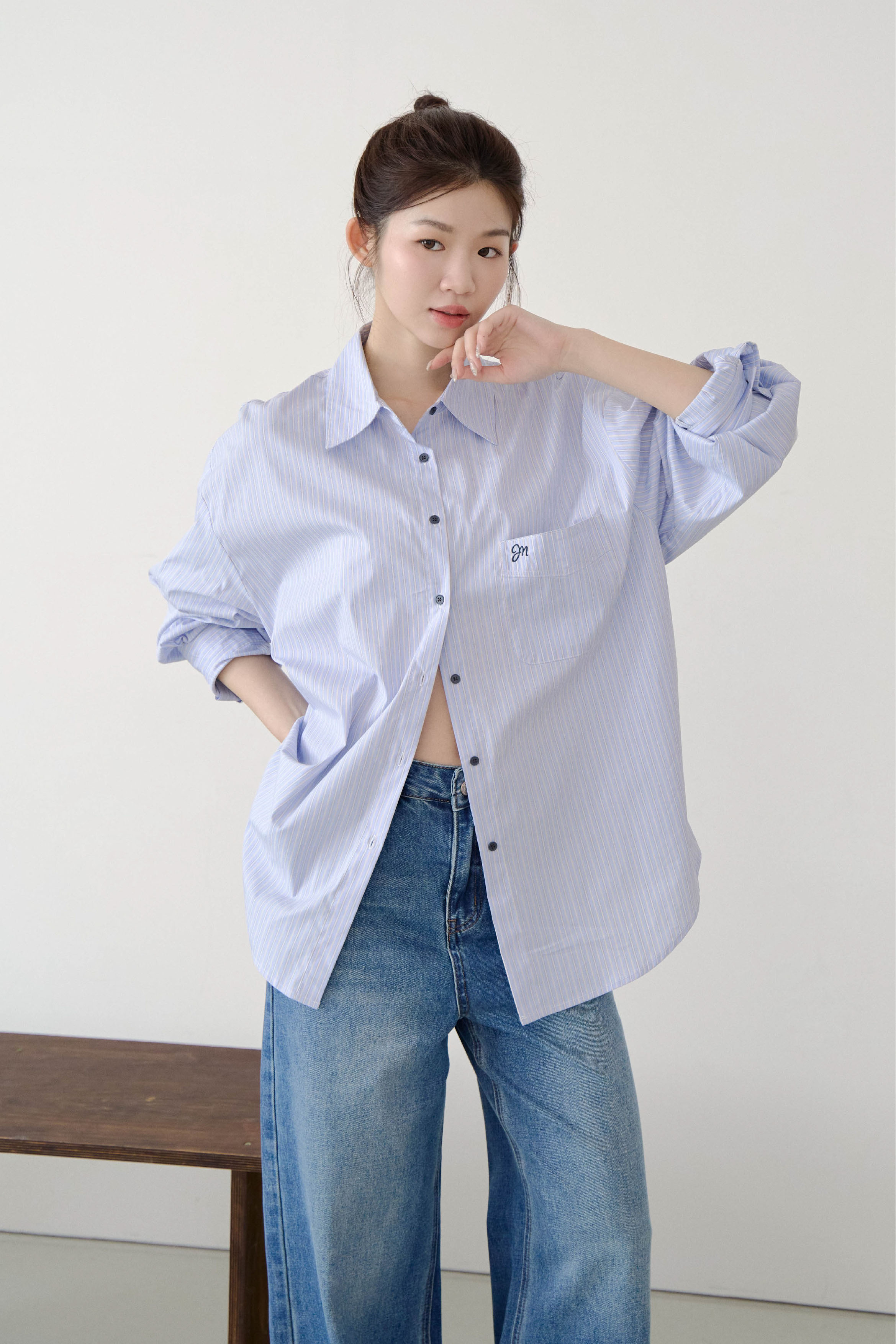品牌M刺繡字 / 挺版純棉布料 / 配色直條紋 / 胸前單口袋 / 袖口打摺單釦 / 圓弧下擺 / oversize寬鬆版型 / 背後打摺造型