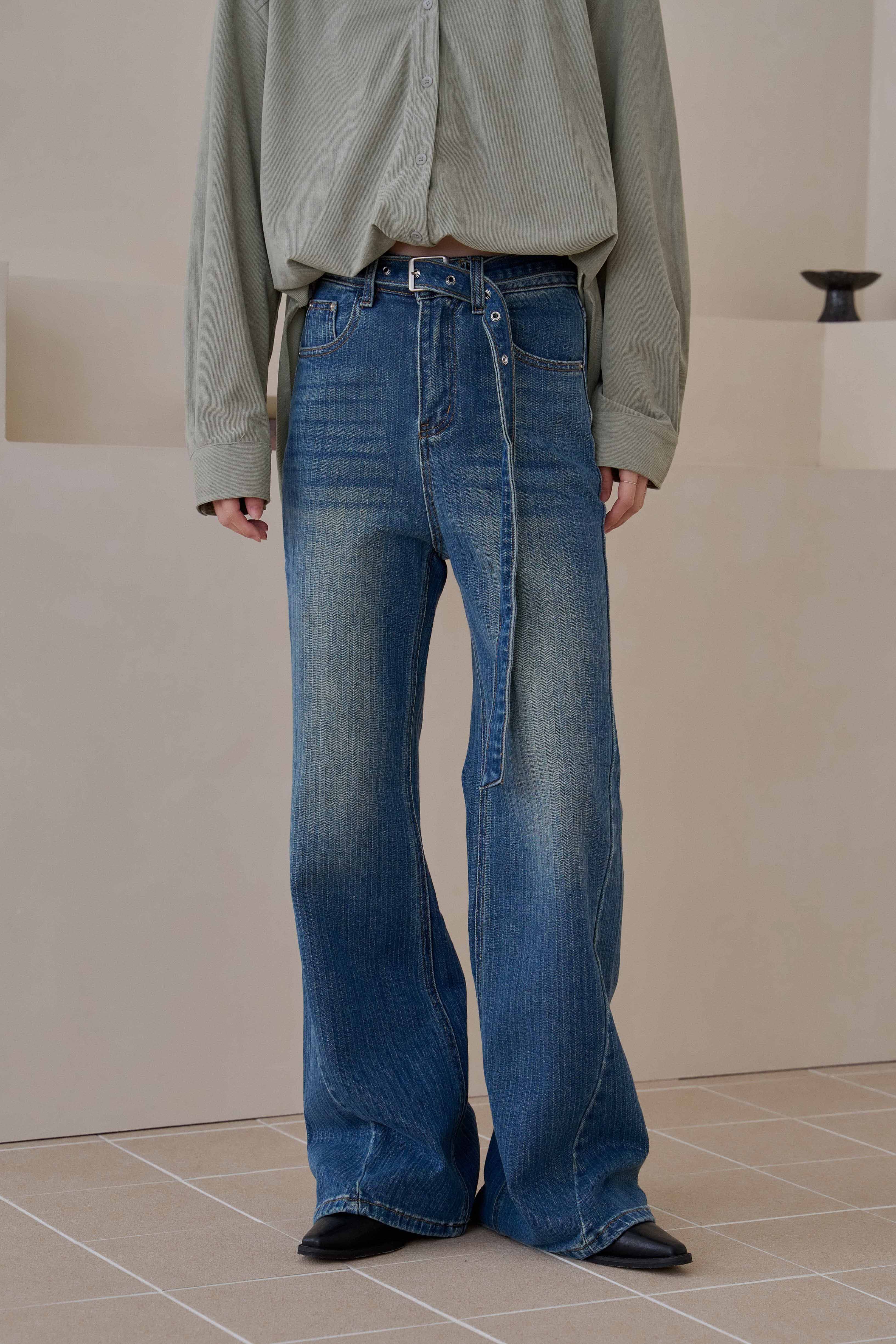 同牛仔布料銀圓皮帶,可拆式 / 隱約直紋刷色造型 / 喇叭修身版型 / 兩側有弧形口袋,後臀有貼式口袋
