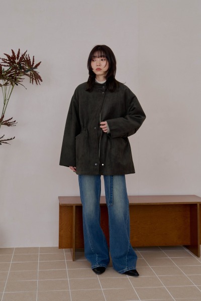 質感麂皮面料 / 前側壓釦,隱藏拉鍊設計 / 內有調節環可調節腰節鬆緊 / 前有兩斜口袋 / 袖口反摺格紋造型 / 有內裡