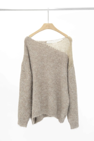 大圓領 / 單肩透肌簍空設計 / 寬鬆版型 / 袖口、下擺羅紋設計 / 落肩剪裁