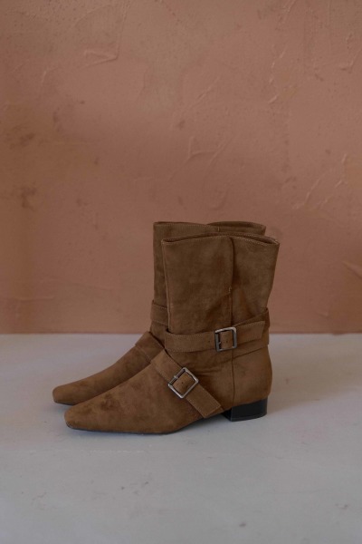 麂皮面料 / 可調式兩釦環造型 / 扁方頭版型