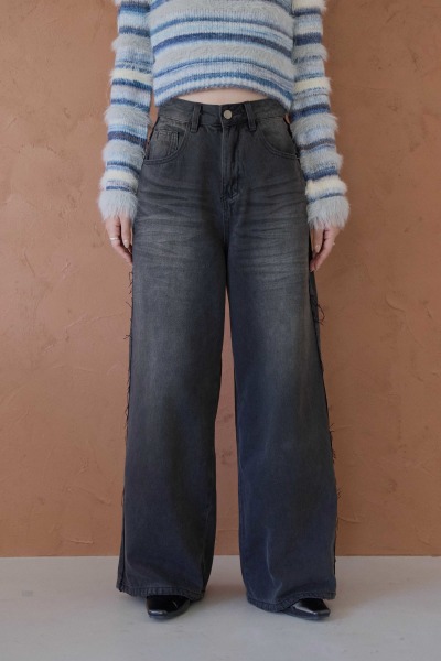 直挺牛仔面料 / 皺皺感刷紋造型 / 側邊不收邊抽鬚設計 / 後臀處刷色造型 / 寬直筒版型 / 兩側有弧形口袋,後臀有貼式口袋
