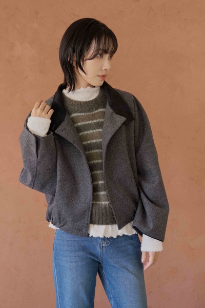 混色人字紋毛呢面料 / 領處、袖口內裡拼接皮布料 可反摺露出增添造型 / 領處雙釦、下擺一釦、無拉鍊 / 袖口單釦 / 無肩線 落肩寬袖剪裁 / 前兩斜口袋 / 下擺鬆緊造型 / 有內裡