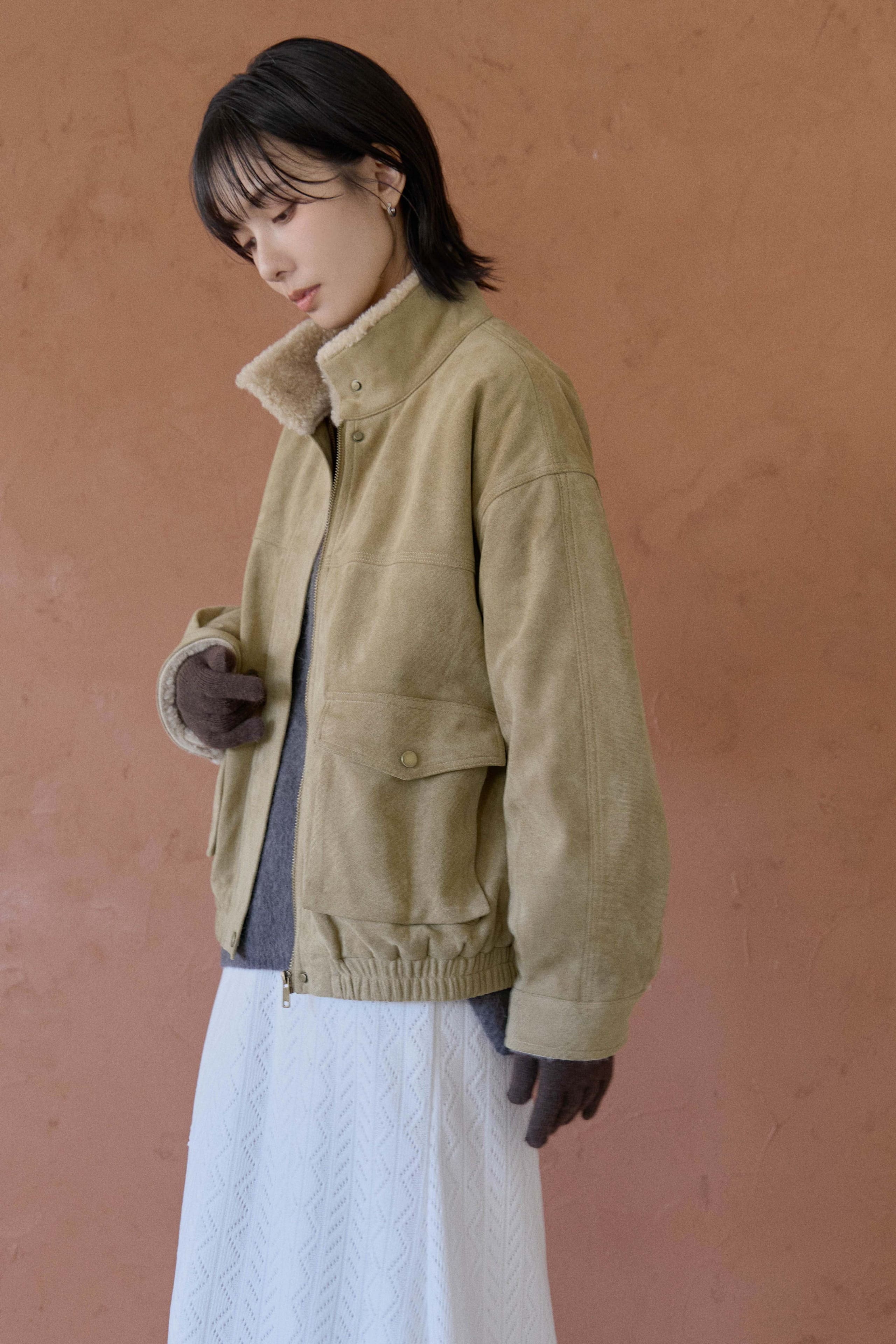 麂皮面料 / 領處一壓釦 可立領或翻領 / 衣身壓釦隱藏式拉鍊 / 前兩掀蓋式口袋 / 袖口壓釦 打摺設計 / 下擺鬆緊造型
