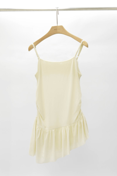 軟絨面布料 / 側腰身抓褶彈性帶設計 / 裙擺斜切剪裁 / 肩帶可調節 / 下擺有內裡 / 可做疊搭造型