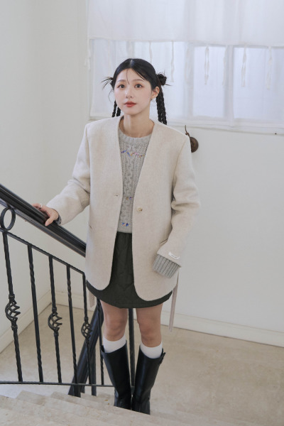 混色毛毛感面料 / V領版型 / 簡約單釦設計 / 前身有口袋 / 下擺圓弧剪裁 / 無內裡 / 寬鬆版型
