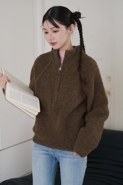 鬆軟感針織面料 / 混色細織捲捲造型 / 開襟半拉鍊設計 / 接袖處立體車線 / 無肩線落肩版型 / 下擺內縮設計 / 領口、袖口、下擺羅紋設計