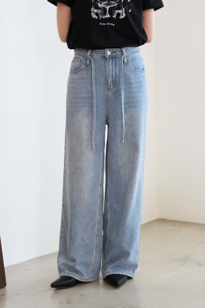 軟牛仔面料 / 可拆式綁帶造型 / 順身直筒版型 / 雙褲耳設計 / 兩側有弧形口袋,後臀有貼式口袋