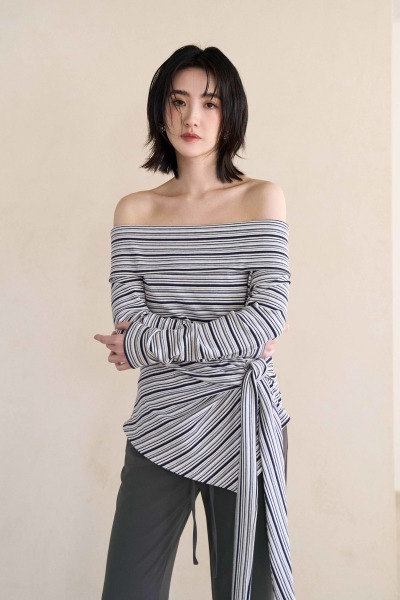 面料有彈性穿著舒適 / 外翻一字領露肩設計 / 下擺單側綁結造型 / 斜角剪裁