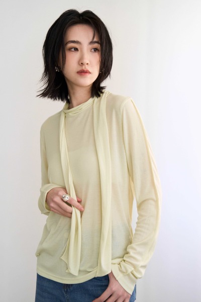親膚舒適軟布料 / 前領處連接造型領巾設計 / 袖身立體剪接線 / 後半排釦設計