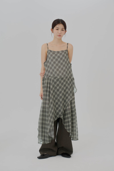 肩帶可自行調整長度 / 雙層不規則傘擺剪裁 / 無口袋 / 有內裡 / 前後平口造型