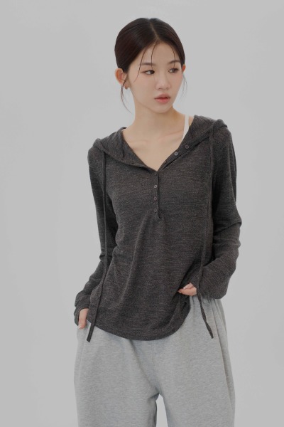 開襟半排釦設計 / 連帽綁帶調節造型 / 灰黑混線面料 / 日常休閒感