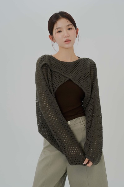 背心與外罩可分開自由搭配 背心:肩帶不可調整長度 / 平口造型,內層無BRA TOP 外罩:彈性洞洞簍空針織面料 / 下擺微捲邊造型 / 前胸交疊設計 / 落肩寬鬆袖可修飾手臂
