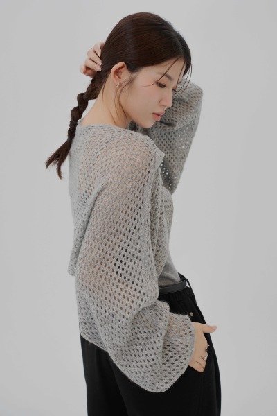 背心與外罩可分開自由搭配 背心:肩帶不可調整長度 / 平口造型,內層無BRA TOP 外罩:彈性洞洞簍空針織面料 / 下擺微捲邊造型 / 前胸交疊設計 / 落肩寬鬆袖可修飾手臂