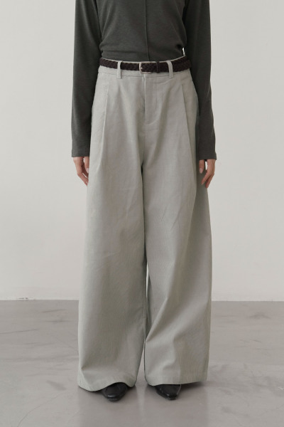 燈芯絨面料 / 單打摺設計 / 寬筒版型 / 兩側有隱形口袋 / 後為造型假口袋