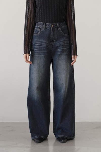 直挺厚實牛仔面料 / 不規則刷紋造型 / 寬直筒版型 / 兩側有弧形口袋,後臀有貼式口袋