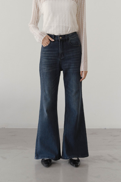 貓鬚紋、刷白感造型 / 前弧剪接線設計, 視覺內收具有修飾效果 / 喇叭版型 / 兩側有弧形口袋,後臀有貼式口袋