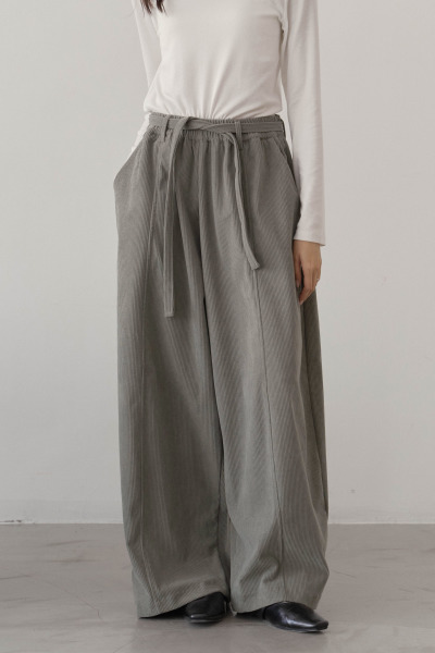 厚磅絨坑條面料 / 側弧繭型輪廓 / 全鬆緊腰圍 / 附綁帶可拆式 / 兩側有口袋