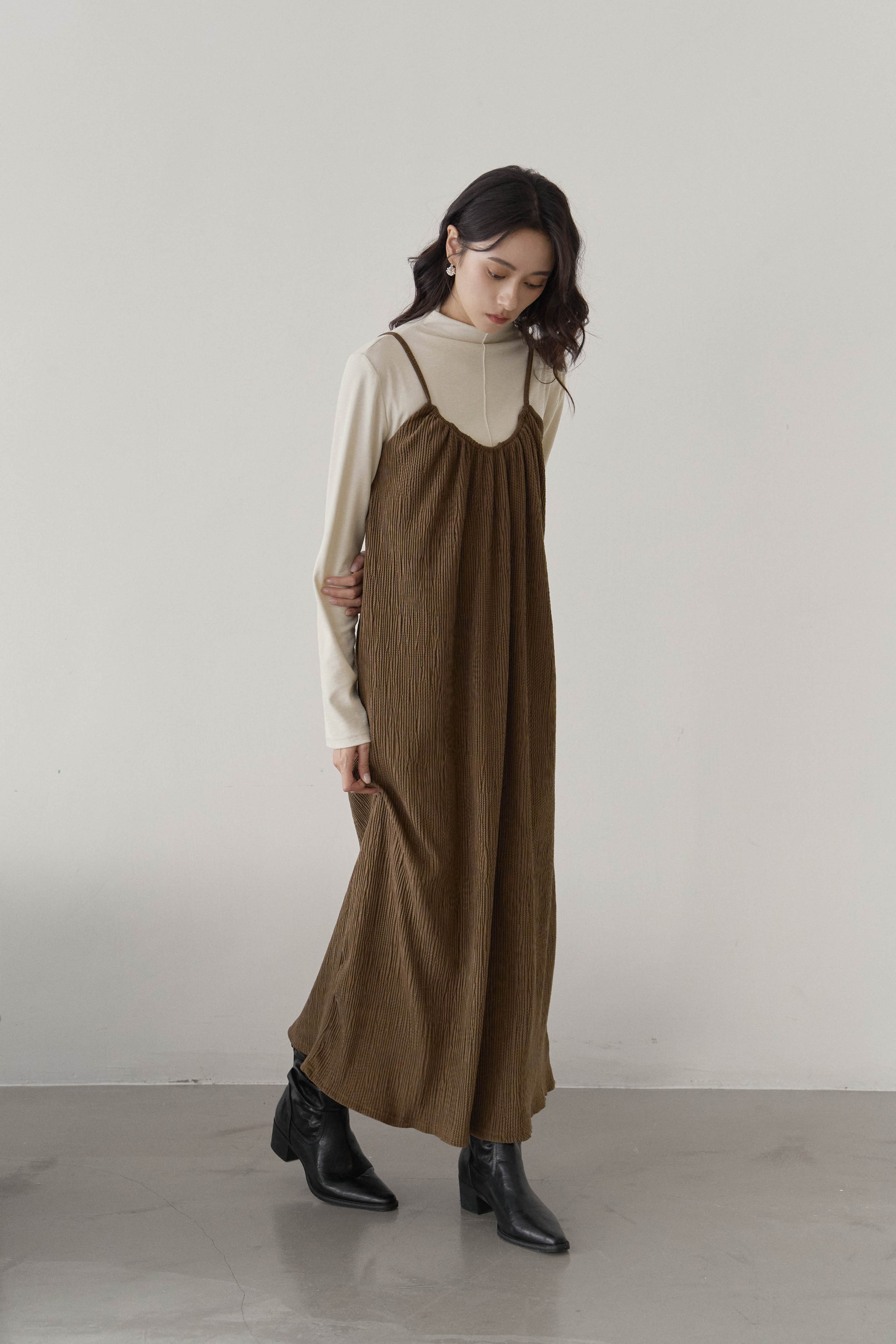 不規則壓紋絨面吊帶洋裝