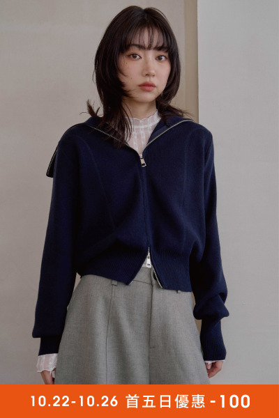 雙頭拉鍊設計 可自由變化造型 / 大翻領直紋造型 / 厚磅針織面料 / 袖口、下擺縮口設計