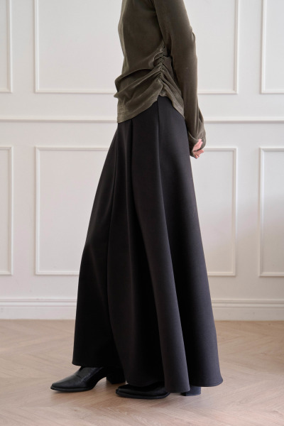 斜紋厚磅毛呢面料 / 兩側拼接壓摺設計 / 寬鬆傘擺版型 / 有褲耳可搭配皮帶 / 無內裡 內層為舒適短絨 / 無口袋 / 後拉鍊