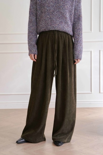 細短絨保暖面料 / 內抽繩鬆緊腰頭 / 寬鬆版型 / 兩側斜口袋 / 打摺設計 / 後貼式口袋
