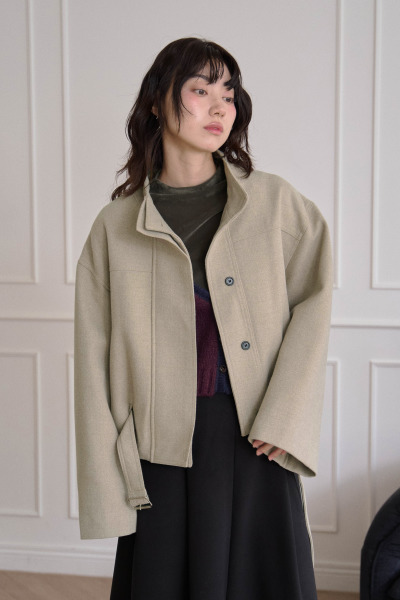 挺實毛呢面料 / 雙層隱藏釦設計 / 落肩寬袖剪裁 / 前兩側有口袋 / 下擺鬆緊造型 / 前下擺固定皮帶環設計 / 有內裡