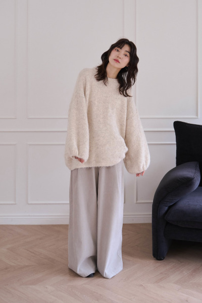 交錯編織織紋 / 毛毛混色感面料 / 可愛澎澎袖設計 / 寬鬆落肩版型 / 領口、袖口、下擺羅紋設計