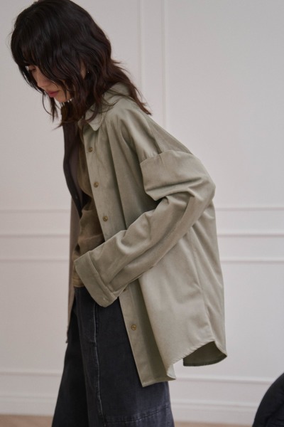 細絨坑條面料 / 下擺圓弧剪裁 / 袖口打摺單釦 / 落肩寬鬆版型 / 背後打摺