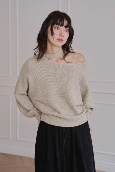 細格織紋 / 套頸露肩造型 / 無肩線落肩版型 / 袖口、下擺羅紋設計