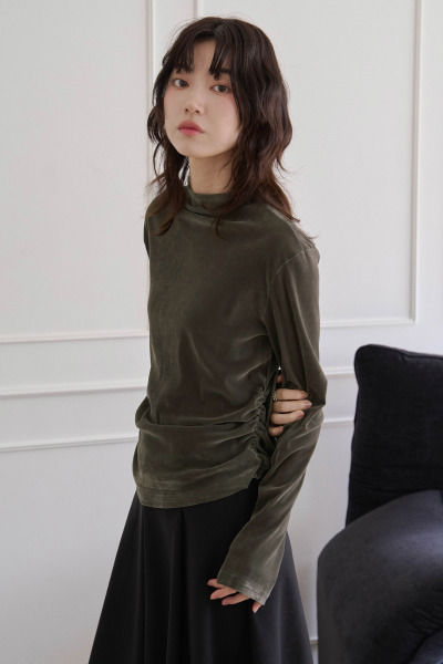 質感細緻天鵝絨 / 有彈性微透面料 / 立領設計 / 側邊抓褶設計 修飾顯瘦 / 合身版型